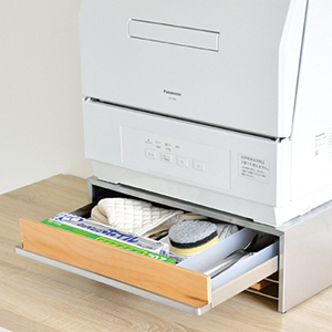 食洗機の下に収納とまな板を干せるスペースをプラス。脱着式構造で掃除も楽に行えます。