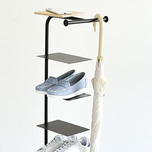 シューズラックに傘立てや靴べらなどを引っ掛ける事ができる収納をプラス。