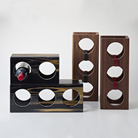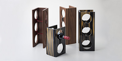 縦横どちらでも使う事ができる、丸と四角で出来た構造の「HO-EN(方円)」。 布を挟みジョイントされた3枚の板は、手軽に組み立てる事ができ、使わない時は 嵩張らず収納できる持ち運びにも便利なワインラックです。V 溝を利用する事でスタッキングが可能になり、スライドさせたり 天板を活用する事で様々な組み合わせのディスプレイを可能にします。