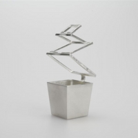 A vase that evolved to have a function that, with a series of rings, allows height adjustment and insertions of flowers from 360º. Its design took advantage of the characteristics of tin that keeps water clean and can be bent freely. You may hang it or put in on the wall.