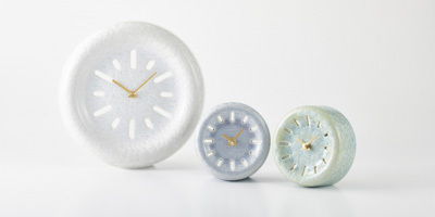 The clock has two types, i.e., wall-mounted and standing one which is inspired by a structure of traditional Koro (incense burner) created by Kyo and Kiyomizu Pottery. It’s a beautiful clock characterized by its petal-like luster created by a glaze called Hana Kessho (flower crystal) and the delicate curve unique to porcelain.
